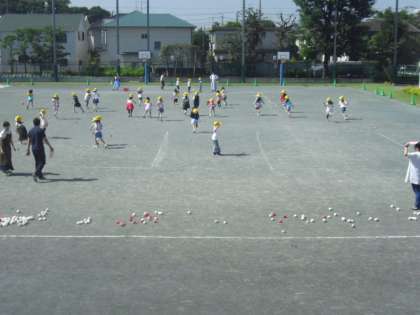 1年生は、赤白の玉を使って、投げる練習を校庭で開始です・・・