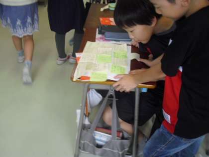 発表を聞いて気付いたことを付箋に書き、その班に渡して・・・