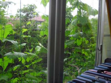 雨のおかげで、緑のカーテン(ECO)であるゴーヤも大きくなってきましたよ・・・