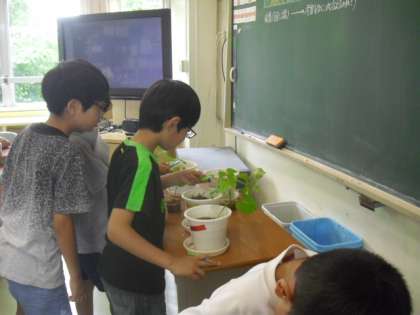 条件を変えて育ちを比較した植物を観察し、ノートにまとめていました。