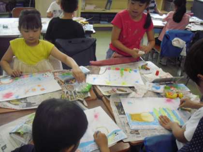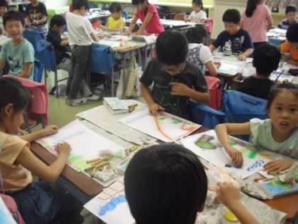 2年生がクレパスを使ってザリガニのすみかを描いていました〜