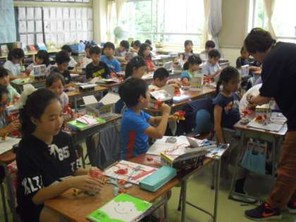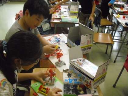 モーターを早く回すには、どのように乾電池をつないだらよいのか、実際につなぎ確かめていました。