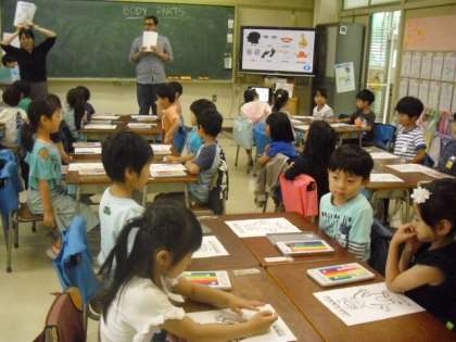 先生が色を、ALTが体の部分を伝え、その場所にみんなで色塗りです。