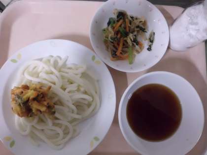 冷やしつけ麺・牛乳・野菜のかきあげ・ごまあえ