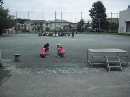 校庭で外遊びをしていた児童は、建物から離れ、集まり、しゃがんで身を守りました。