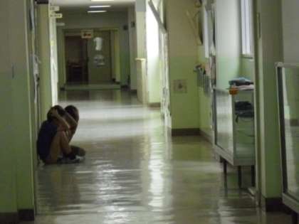 廊下を通行中の児童は、壁際で頭を守ってしゃがみました。