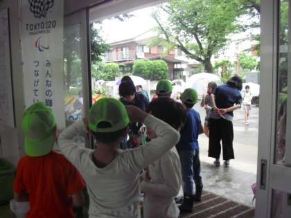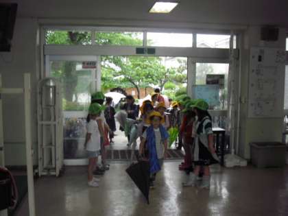 挨拶隊も、昇降口のひさしの下でお出迎えです・・・・