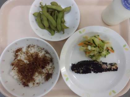 麦ご飯・牛乳・手作りふりかけ・鮭のごま焼き・和風サラダ・☆枝豆