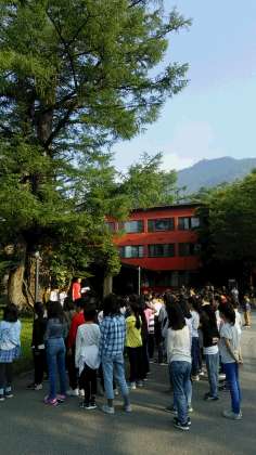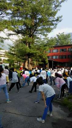 宿舎前で朝会、体操を行いました。今日は予定通りハイキングを行います。