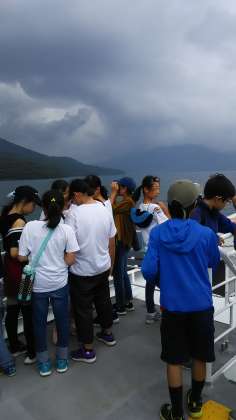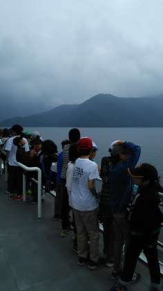 中禅寺湖のクルージングです。みんな気持ちのよい風を浴びつつ眺めの美しさを楽しんでいます。