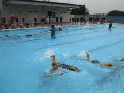 準備運動のあと音楽に合わせて水慣れをしました。そして「けのび」「ばた足」と移り、久しぶりのプールに親しんでいました。