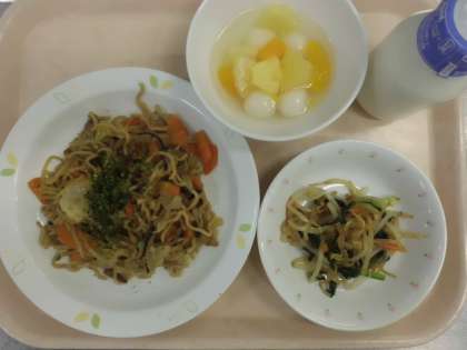 ソース焼きそば・牛乳・ナムル・フルーツ白玉