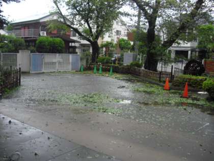 暴風警報は解除されましたが朝方までの強風で、道路にも枝葉が散乱しています。