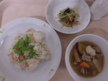 鮭ずし・牛乳・菊花入りお浸し・さつま汁