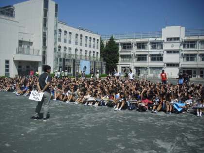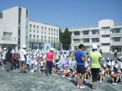 校庭で人数確認をし、地震発生や緊急地震速報が流れた際の対応について確認しました。