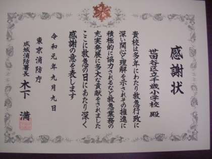 千歳小学校で、毎年救急救命講習を受講するなど救急業務の充実・発展に貢献したということで、東京消防庁 成城消防署長様より、感謝状をいただきました。