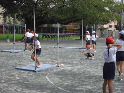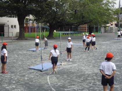 4年生の走・跳の運動で、高跳びは短い助走から踏み切って跳ぶ動きができるようにします。動きのポイントを知り自分の力にあった課題を選ぶことも大事な学習です。