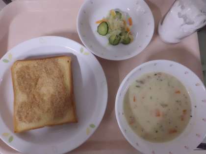 セサミトースト・牛乳・クラムチャウダー・コールスローサラダ
