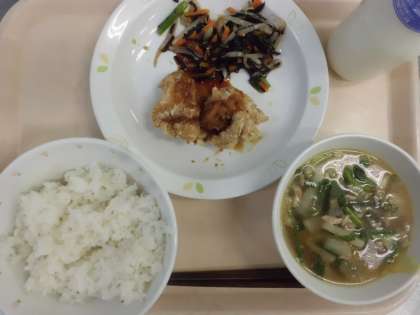 ごはん・牛乳・韓国風鶏のからあげ・ひじきナムル・キムチスープ
