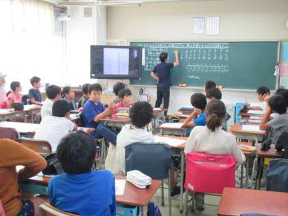 東京都算数教育研究会の研究発表の事前授業として、5年生の算数「比例」の授業が行われました。課題は「正方形の数とストロー(棒)の本数が増える関係」です。子どもたちは自分なりにノートにまとめたり友達の考えを聞いたりして、表に整理することのよさを学んでいました。