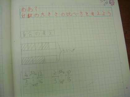 分母の違う分数の大きさの比べ方を考えながら、理解を深めていました。