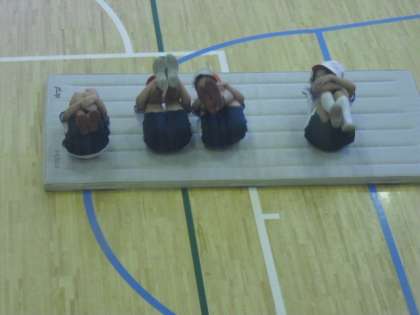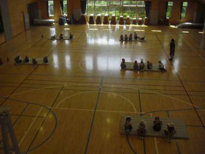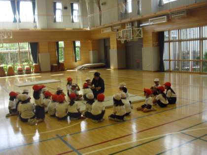 今日は背中を丸めて「ころん」と転がる感覚を、手本となる友達の動きも確認しながら、みんなで味わい学習していました。