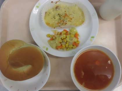 あしたばパン・牛乳・ポテトクリーム焼き・キャベツとコーンのソテー