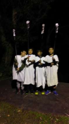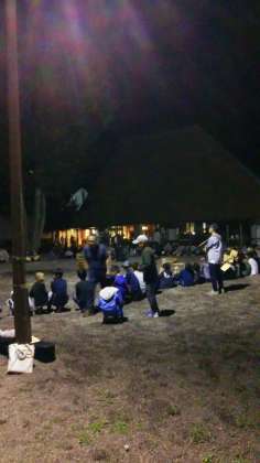 まもなく始まるキャンプファイヤーの係が集まってスタンバイです。すてきな夜の集会になりますように!