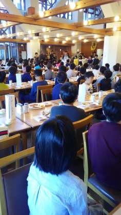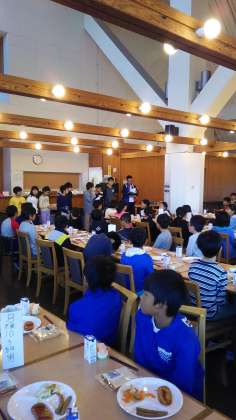 おはようございます。三日目の朝も天気はよいです。布団たたみと部屋を片付け、朝会を行い、宿舎での最後の朝食をとりました。今日は 村巡りを行います。