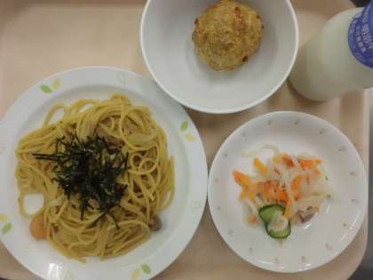 和風スパゲティ・牛乳・大根とツナのサラダ・さつま芋のごま団子