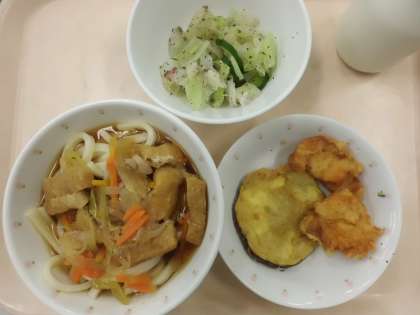 五目うどん・牛乳・天ぷら(鶏・さつま芋)・野菜のゆかりかけ