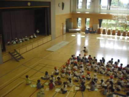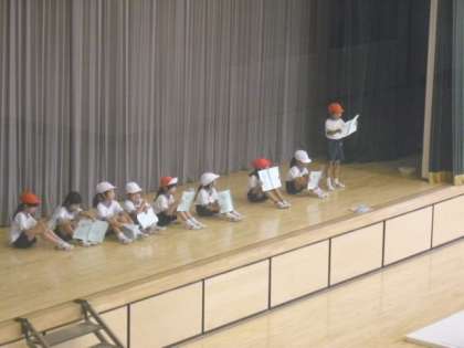 体育館では1年生が集まって、みんなの前で大きな声で発表〜