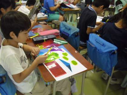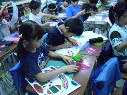 色セロハンを貼って、ステンドグラス調の作品づくりがすすんでいました。