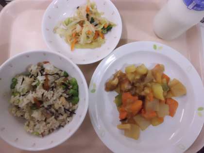 ひじきごはん・牛乳・治部煮・野菜のからし和え