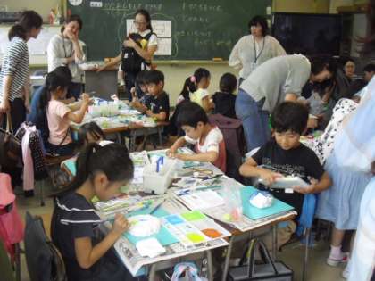 細かな色付けを行う子ども・・・