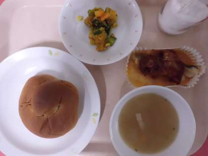 黒砂糖パン・牛乳・魚のピザ風・パンプキンサラダ・野菜スープ