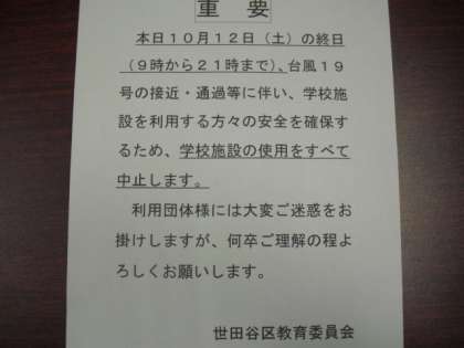 台風接近に伴い、公共交通機関の計画運休などもあり、学校施設を利用する方々の安全を確保するため、明日12日(土)の学校施設開放の使用はすべて中止となります。