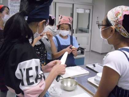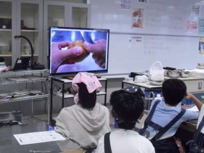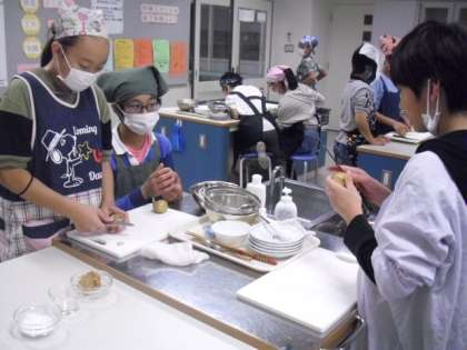 大型画面に映し出された手順を確認してジャガイモの皮むきが始まりました〜