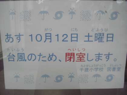 手紙でも連絡しましたように、明日10月12日(土)は土曜授業日でしたが、台風19号の接近・通過等に伴い臨時休校となります。