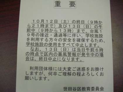 13日の13時まで、台風接近・通過等に伴い、学校施設の使用は中止です。