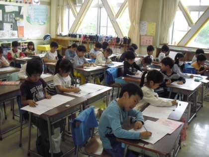 低学年では、経験したことや想像したことなどについて、順序を整理し、簡単な構成を考えて文や文章を書く能力を身に着けさせるとともに、進んで書こうとする態度を育てています。
