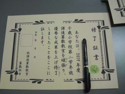 その学年の学習カードをすべて終了すると、賞状を渡しています。