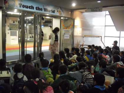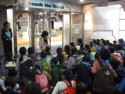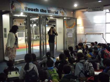 多文化体験コーナーの入り口で、英語の発音練習〜