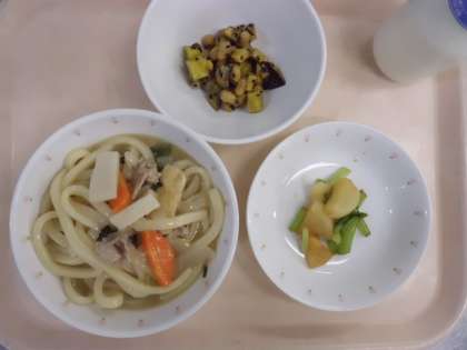 煮込みうどん・牛乳・かぶのレモン漬け・お豆かりんとう