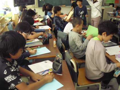 2学期に出かけた5年生が、総合の時間を使って調べてきたことや、実際に訪れて見聞きしたり、体験したりしてきたことをまとめ、4年生に伝える活動に取り組んでいます。