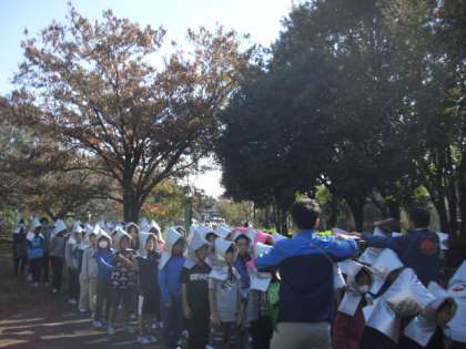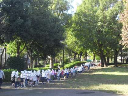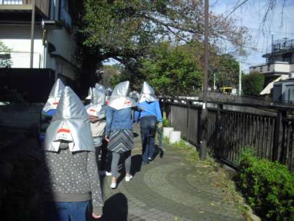 今日は第2次避難の訓練で、祖師谷公園への避難の仕方を練習しました。