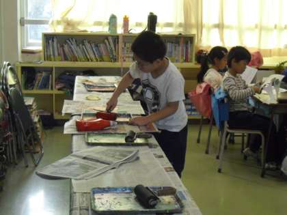 版画がインクをつけてすることに挑戦〜