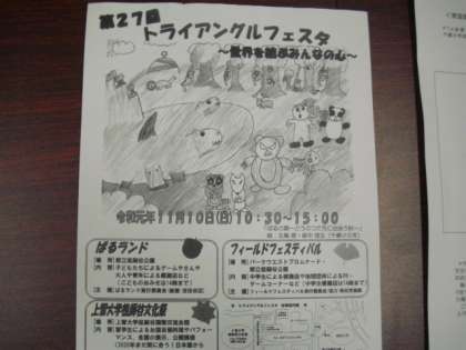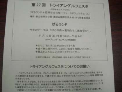 トライアングルフェスタとは、ぱるランド実行委員騎亜、フィールドフェスティバル実行委員会、祖師谷文化祭実行委員会が主催する、千歳小学校、烏山小学校の子供たちを中心としたおまつりです。