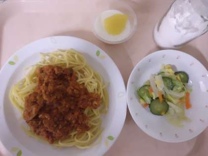 スパゲティミートソース・牛乳・フレンチサラダ・パンナコッタ