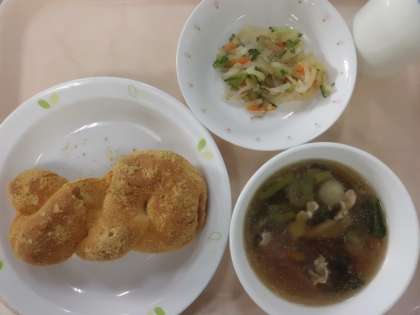 きなこあげパン・牛乳・春雨スープ・じゃこのカリカリサラダ